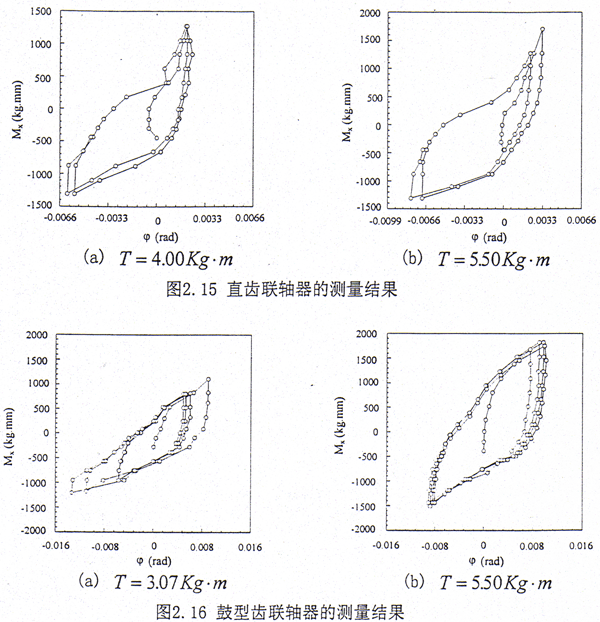 (5)對(duì)鼓形齒聯(lián)軸器在加載階段轉(zhuǎn)的平均轉(zhuǎn)角剛度ka進(jìn)行了計(jì)算,結(jié)果如下:在T=3.07kg·m時(shí),ka≈9.2×104kg·mm;在T=5.50gk·m時(shí),ka≈1.1×105kg·mm。對(duì)于直齒聯(lián)軸器Mx-φ的關(guān)系呈現(xiàn)出非線性,轉(zhuǎn)角剛度ka即為曲線的斜率,從圖2.15可知轉(zhuǎn)角剛度ka是變化的。在轉(zhuǎn)角取大值時(shí),ka值較大;在轉(zhuǎn)角取小值時(shí),ka值比較小。為了便于比較,在此對(duì)文獻(xiàn)[31]中(其中參數(shù)為:鼓形齒輪聯(lián)軸器模數(shù)為2.5,齒數(shù)為35,T=15.0kg·m,鼓形量為113~140微米)的測(cè)試結(jié)果也進(jìn)行了計(jì)算,結(jié)果為ka≈9.1×105kg·mm,造成二者結(jié)果的差距主要是外載荷和由于齒輪結(jié)構(gòu)參數(shù)的不同而引起齒對(duì)剛度具有相當(dāng)大的差別,但從總體來(lái)說(shuō)這一轉(zhuǎn)轉(zhuǎn)角剛度的數(shù)量級(jí)不大。因此在實(shí)際系統(tǒng)的動(dòng)力學(xué)分析中,齒輪聯(lián)軸器的轉(zhuǎn)角剛度應(yīng)取一小量。